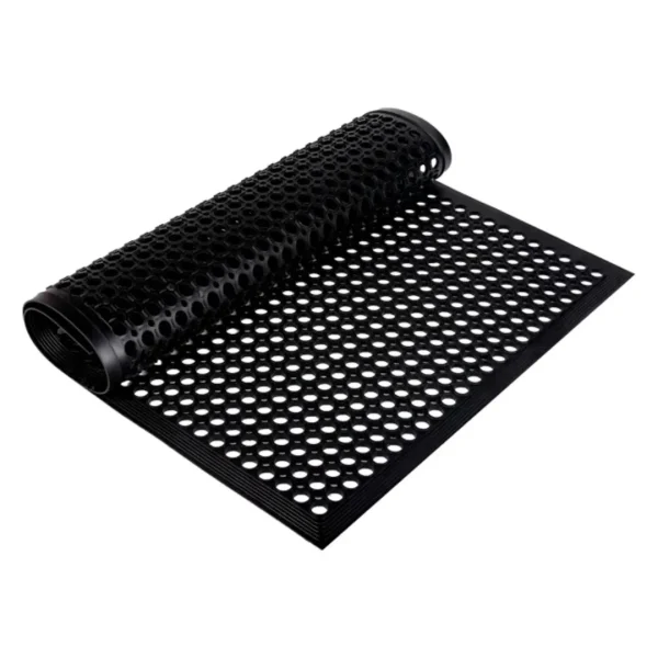 Plancha antifatiga, antideslizante y con drenaje, fabricada en un compuesto de Caucho Natural (NR) y Caucho Butadieno (SBR). Su diseño, con orificios y ranuras, brinda una superficie antideslizante y protectora con efecto antifatiga, mejora la seguridad y el flujo en zonas húmedas.